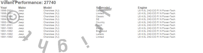 Below is an abbreviated list of applications for the Cold Air Intake Kit.Cherokee (XJ), Jeep, 2001, 2000, 1999, 1998, 1997, 1996, 1995, 1994, 1993, 1992, 1991