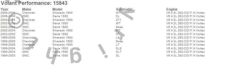 Below is an abbreviated list of applications for the Cold Air Intake Kit.Sierra 1500, Silverado 1500, Chevrolet, GMC, 2006, 2005, 2004, 2003, 2002, 2001, 2000, 1999