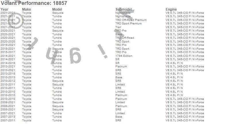 Below is an abbreviated list of applications for the Cold Air Intake Kit.Sequoia, Tundra, Toyota, 2021, 2020, 2019, 2018, 2017, 2016, 2015, 2014, 2013, 2012, 2011, 2010, 2009, 2008, 2007