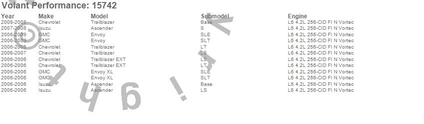 Below is an abbreviated list of applications for the Cold Air Intake Kit.Ascender, Envoy, Envoy XL, Trailblazer, Trailblazer EXT, Chevrolet, GMC, Isuzu, 2009, 2008, 2007, 2006