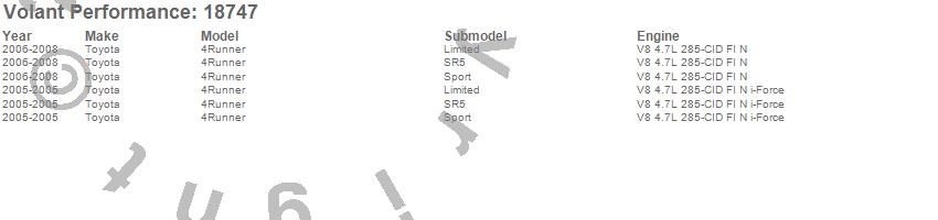 Below is an abbreviated list of applications for the Cold Air Intake Kit.4Runner, Toyota, 2008, 2007, 2006, 2005