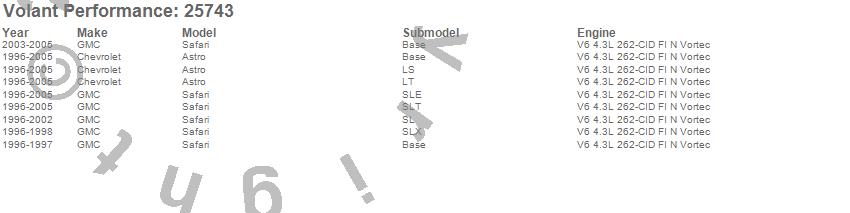 Below is an abbreviated list of applications for the Cold Air Intake Kit.Astro, Safari, Chevrolet, GMC, 2005, 2004, 2003, 2002, 2001, 2000, 1999, 1998, 1997, 1996