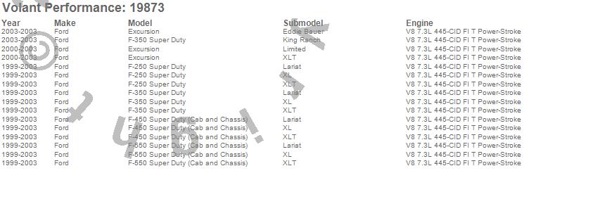 Below is an abbreviated list of applications for the Cold Air Intake Kit.Excursion, F-250 Super Duty, F-350 Super Duty, F-450 Super Duty, F-550 Super Duty, Ford, 2003, 2002, 2001, 2000, 1999