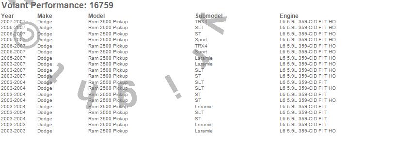 Below is an abbreviated list of applications for the Cold Air Intake Kit.Ram 2500, Ram 3500, Dodge, 2007, 2006, 2005, 2004, 2003