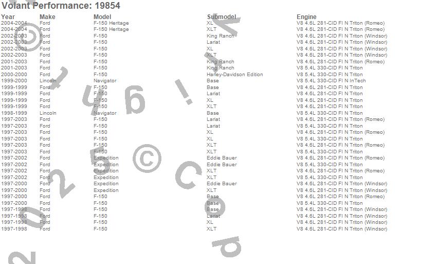 Below is an abbreviated list of applications for the Cold Air Intake Kit.Expedition, F-150, F-150 Heritage, Navigator, Ford, Lincoln, 2004, 2003, 2002, 2001, 2000, 1999, 1998, 1997