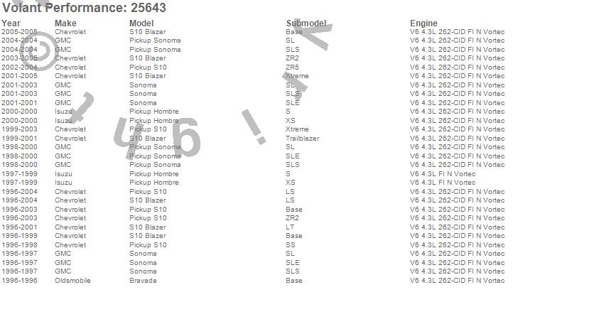 Below is an abbreviated list of applications for the Cold Air Intake Kit.Bravada, Hombre, S10 Blazer, S10 Pickup, Sonoma, Chevrolet, GMC, Isuzu, Oldsmobile, 2005, 2004, 2003, 2002, 2001, 2000, 1999, 1998, 1997, 1996