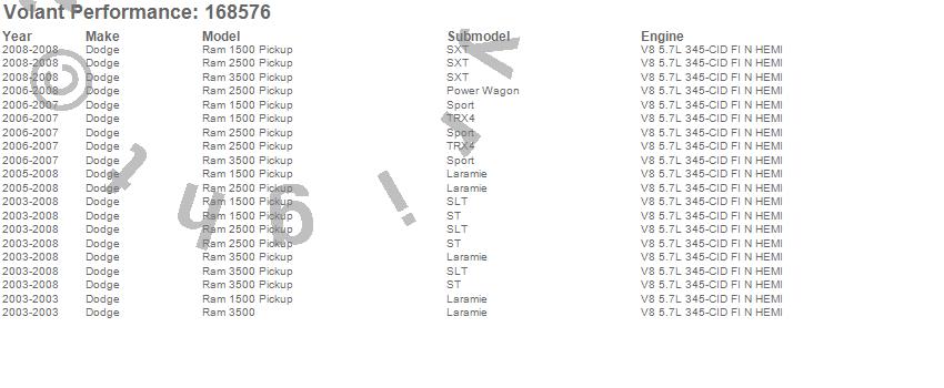 Below is an abbreviated list of applications for the Cold Air Intake Kit.Ram 1500, Ram 2500, Ram 3500, Dodge, 2008, 2007, 2006, 2005, 2004, 2003
