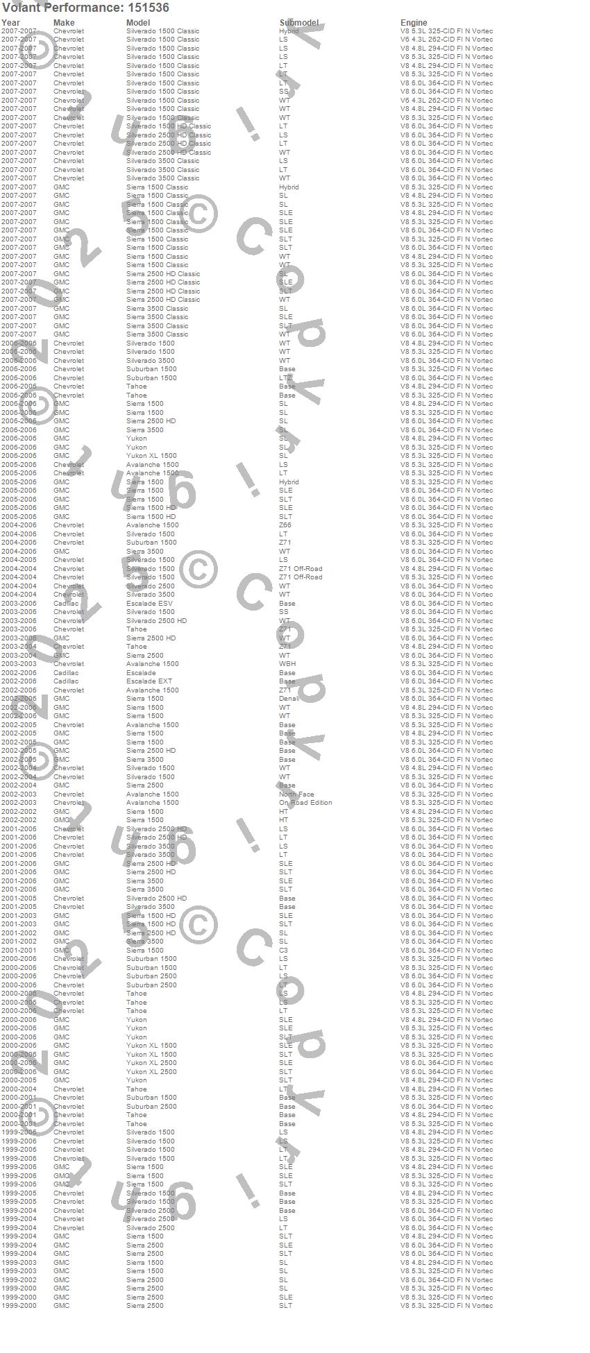Below is an abbreviated list of applications for the Cold Air Intake Kit.Avalanche 1500, Escalade, Escalade ESV, Escalade EXT, Sierra 1500, Sierra 1500 Classic, Sierra 1500 HD, Sierra 2500, Sierra 2500 HD, Sierra 2500 HD Classic, Sierra 3500, Sierra 3500 Classic, Silverado 1500, Silverado 1500 Classic, Silverado 1500 HD Classic, Silverado 2500, Silverado 2500 HD, Silverado 2500 HD Classic, Silverado 3500, Silverado 3500 Classic