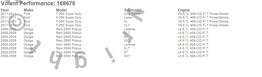 Below is an abbreviated list of applications for the Cold Air Intake Kit.F-250 Super Duty, Ram 2500, Ram 3500, Dodge, Ford, 2011, 2009, 2008
