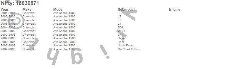 Below is an abbreviated list of applications for the Pro-Line Replacement Carpet.Avalanche 1500, Avalanche 2500, Chevrolet, 2006, 2005, 2004, 2003, 2002