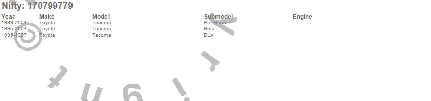 Below is an abbreviated list of applications for the Pro-Line Replacement Carpet.Tacoma, Toyota, 2004, 2003, 2002, 2001, 2000, 1999, 1998, 1997, 1996, 1995