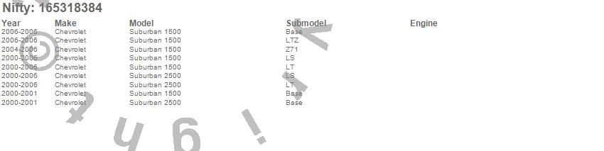 Below is an abbreviated list of applications for the Pro-Line Replacement Carpet.Suburban 1500, Suburban 2500, Chevrolet, 2006, 2005, 2004, 2003, 2002, 2001, 2000