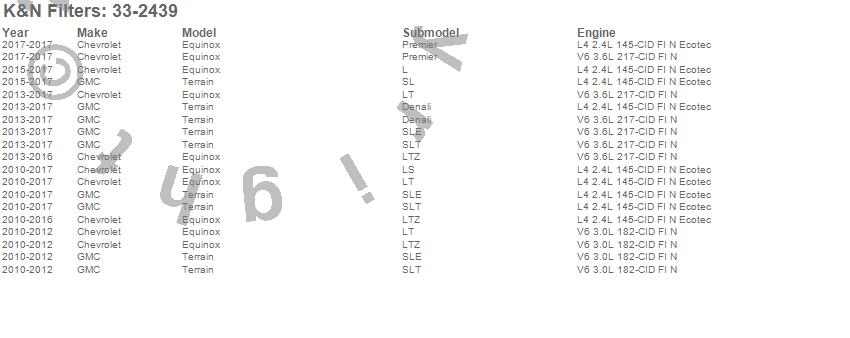 Below is an abbreviated list of applications for the Air Filter.Equinox, Terrain, Chevrolet, GMC, 2017, 2016, 2015, 2014, 2013, 2012, 2011, 2010