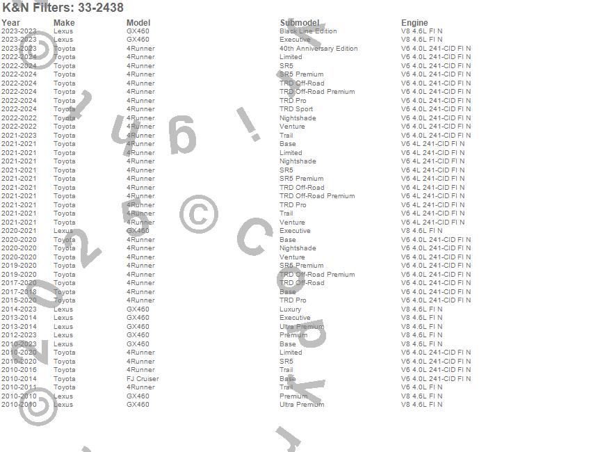 Below is an abbreviated list of applications for the Air Filter.4Runner, FJ Cruiser, GX460, Lexus, Toyota, 2019, 2018, 2017, 2016, 2015, 2014, 2013, 2012, 2011, 2010