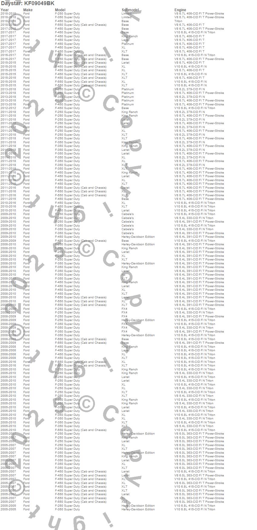 Below is an abbreviated list of applications for the Suspension Combo Kit.F-250 Super Duty, F-350 Super Duty, F-450 Super Duty, F-550 Super Duty, Ford, 2018, 2017, 2016, 2015, 2014, 2013, 2012, 2011, 2010, 2009, 2008, 2007, 2006, 2005