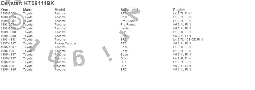 Below is an abbreviated list of applications for the Suspension System/Lift Kit.Tacoma, Toyota, 2004, 2003, 2002, 2001, 2000, 1999, 1998, 1997, 1996, 1995