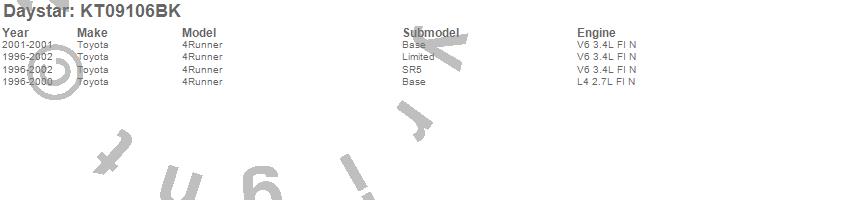 Below is an abbreviated list of applications for the Suspension System/Lift Kit.4Runner, Toyota, 2002, 2001, 2000, 1999, 1998, 1997, 1996