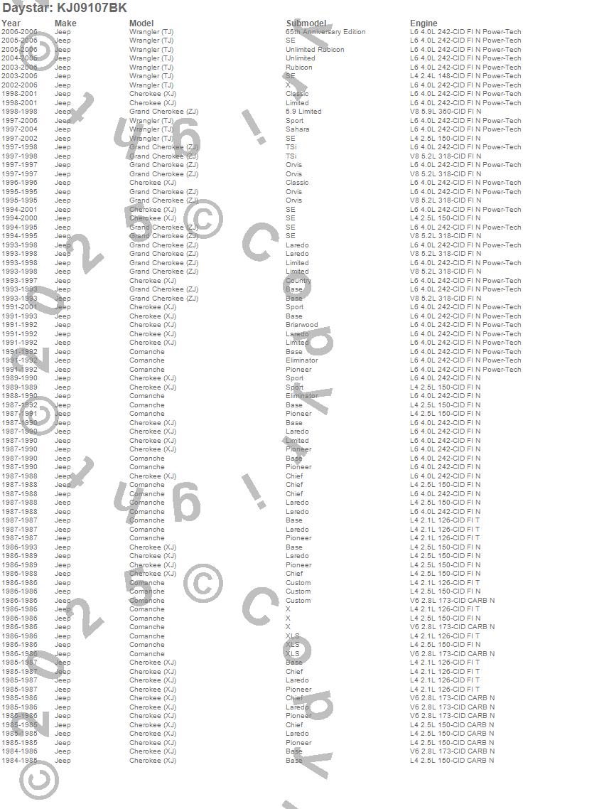 Below is an abbreviated list of applications for the Suspension Coil Spring Spacer Leveling Kit.Cherokee (XJ), Comanche, Grand Cherokee (ZJ), Wrangler (LJ), Wrangler (TJ), Jeep, 2006, 2005, 2004, 2003, 2002, 2001, 2000, 1999, 1998, 1997, 1996, 1995, 1994, 1993