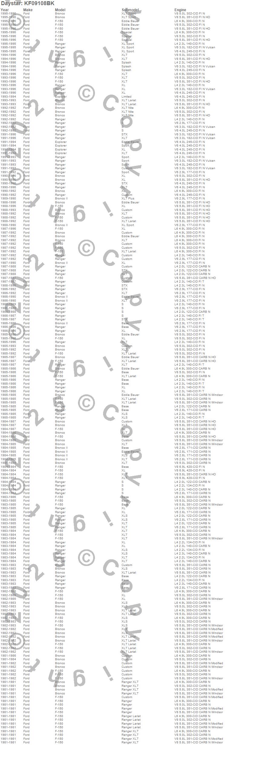 Below is an abbreviated list of applications for the Suspension Coil Spring Spacer Leveling Kit.Bronco, Bronco II, Explorer, F-150, Ranger, Ford, 1996, 1995, 1994, 1993, 1992, 1991, 1990, 1989, 1988, 1987, 1986, 1985, 1984, 1983