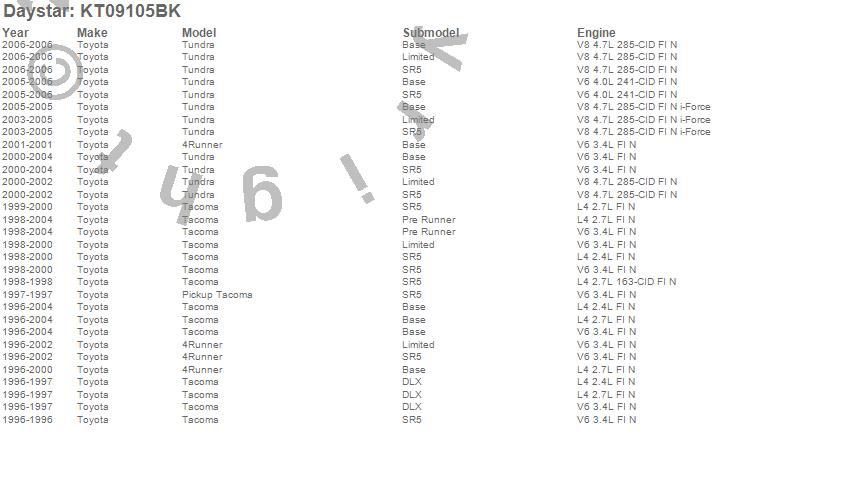 Below is an abbreviated list of applications for the Suspension Strut Spacer Leveling Kit.4Runner, Tacoma, Tundra, Toyota, 2006, 2005, 2004, 2003, 2002, 2001, 2000, 1999, 1998, 1997, 1996
