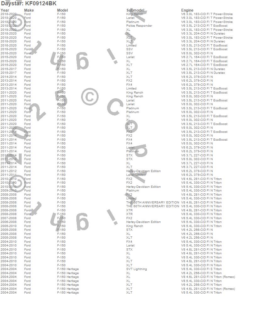 Below is an abbreviated list of applications for the Suspension Strut Spacer Leveling Kit.F-150, F-150 Heritage, Ford, 2018, 2017, 2016, 2015, 2014, 2013, 2012, 2011, 2010, 2009, 2008, 2007, 2006, 2005, 2004
