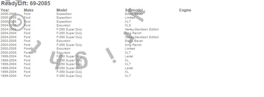 Below is an abbreviated list of applications for the SST Lift Kit.Excursion, Expedition, F-250 Super Duty, F-350 Super Duty, Ford, 2005, 2004, 2003, 2002, 2001, 2000, 1999