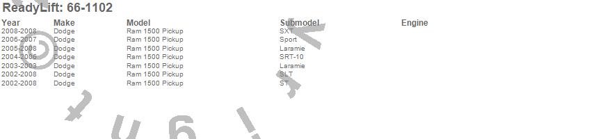 Below is an abbreviated list of applications for the Rear Block Kit.Ram 1500, Dodge, 2008, 2007, 2006, 2005, 2004, 2003, 2002