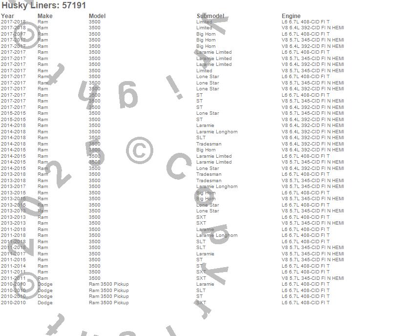 Below is an abbreviated list of applications for the Custom Molded Mud Guards.3500, Ram 3500, Dodge, Ram, 2018, 2017, 2016, 2015, 2014, 2013, 2012, 2011, 2010