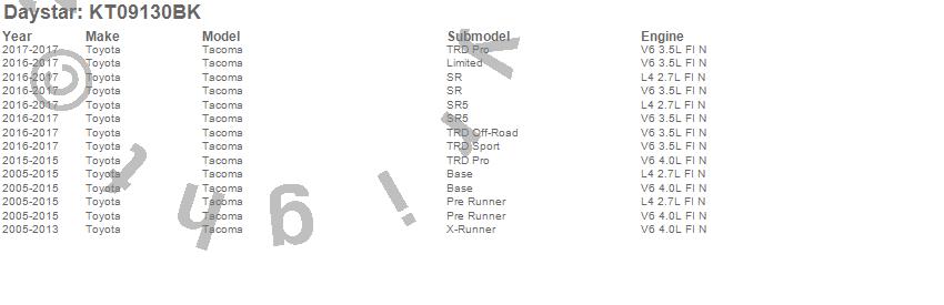 Below is an abbreviated list of applications for the Suspension Combo Kit.Tacoma, Toyota, 2017, 2016, 2015, 2014, 2013, 2012, 2011, 2010, 2009, 2008, 2007, 2006, 2005