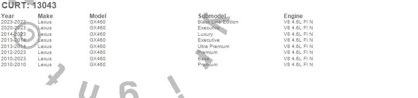 Below is an abbreviated list of applications for the Class III 2 in. Receiver Hitch.GX460, Lexus, 2023, 2022, 2021, 2020, 2019, 2018, 2017, 2016, 2015, 2014, 2013, 2012, 2011, 2010