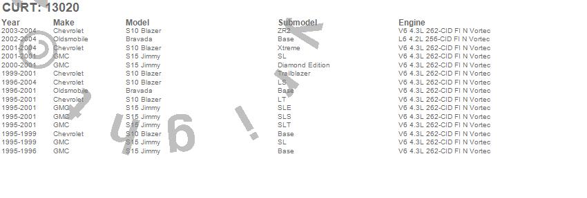 Below is an abbreviated list of applications for the Class III 2 in. Receiver Hitch.Bravada, S10 Blazer, S15 Jimmy, Chevrolet, GMC, Oldsmobile, 2004, 2003, 2002, 2001, 2000, 1999, 1998, 1997, 1996, 1995