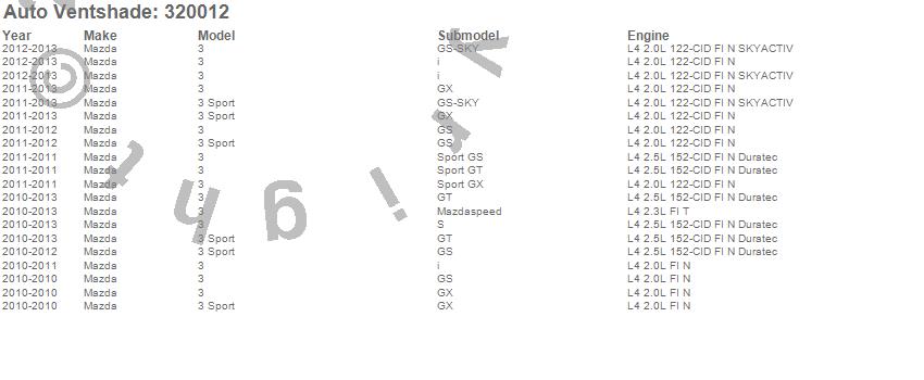 Below is an abbreviated list of applications for the Aeroskin Smoke Hood Protector.3, 3 Sport, Mazda, 2013, 2012, 2011, 2010