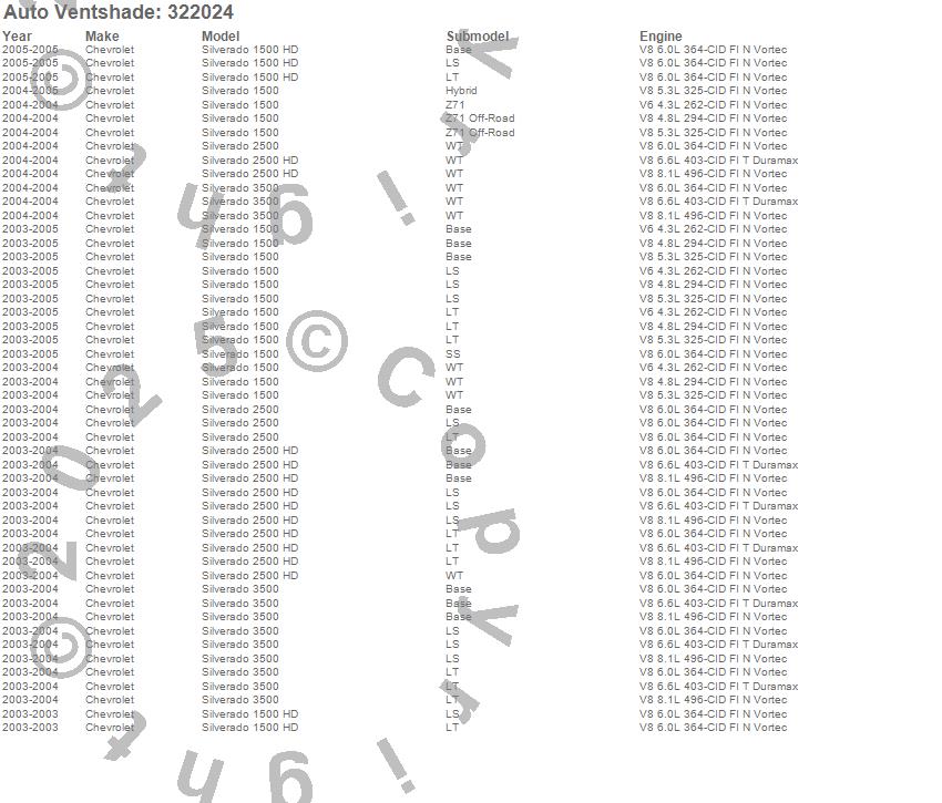 Below is an abbreviated list of applications for the Aeroskin Smoke Hood Protector.Silverado 1500, Silverado 1500 HD, Silverado 2500, Silverado 2500 HD, Silverado 3500, Chevrolet, 2005, 2004, 2003