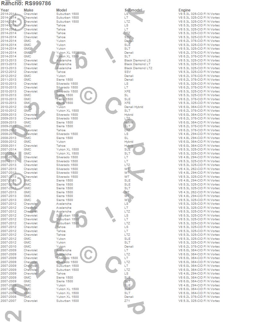Below is an abbreviated list of applications for the RS9000XL Series Suspension Strut Assembly.AVALANCHE, SIERRA 1500, SILVERADO 1500, SUBURBAN 1500, TAHOE, YUKON, YUKON XL 1500, YUKON XL 1500 (Canadian), CHEVROLET, GMC, 2013, 2012, 2011, 2010, 2009, 2008, 2007