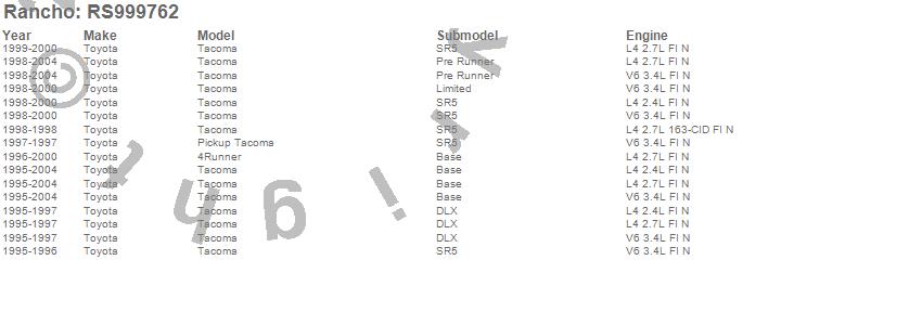 Below is an abbreviated list of applications for the RS9000XL Series Suspension Strut Assembly.4RUNNER, TACOMA, TOYOTA, 2004, 2003, 2002, 2001, 2000, 1999, 1998, 1997, 1996, 1995
