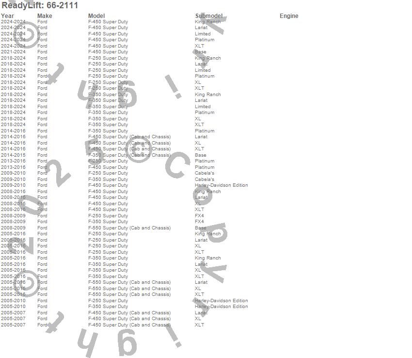 Below is an abbreviated list of applications for the Front Leveling Kit.F-250 Super Duty, F-350 Super Duty, F-450 Super Duty, F-550 Super Duty, F450 Super Duty, Ford, 2025, 2024, 2023, 2022, 2021, 2020, 2019, 2018, 2017, 2016, 2015, 2014, 2013, 2012