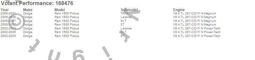 Below is an abbreviated list of applications for the Cold Air Intake Kit.Ram 1500, Dodge, 2007, 2006, 2005, 2004, 2003, 2002