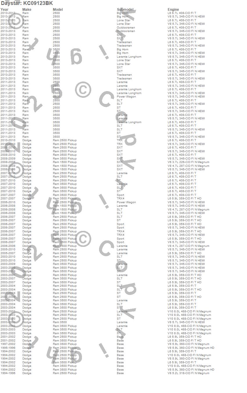 Below is an abbreviated list of applications for the Suspension Combo Kit.2500, 3500, Ram 1500, Ram 2500, Ram 3500, Dodge, Ram, 2013, 2012, 2011, 2010, 2009, 2008, 2007, 2006, 2005, 2004, 2003, 2002, 2001
