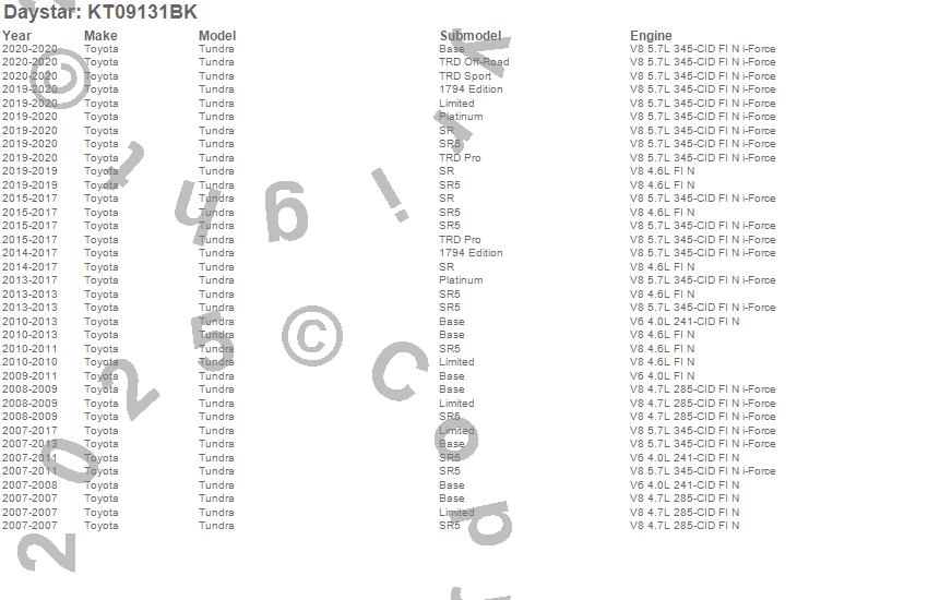 Below is an abbreviated list of applications for the Suspension System/Lift Kit.Tundra, Toyota, 2017, 2016, 2015, 2014, 2013, 2012, 2011, 2010, 2009, 2008, 2007