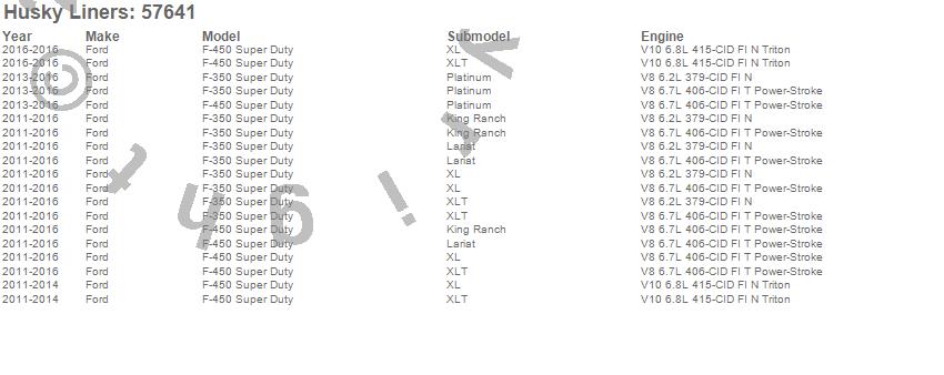 Below is an abbreviated list of applications for the Custom Molded Mud Guards.F-350 Super Duty, F-450 Super Duty, Ford, 2016, 2015, 2014, 2013, 2012, 2011