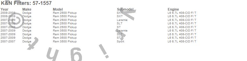 Below is an abbreviated list of applications for the Filtercharger Injection Performance Kit.Ram 2500, Ram 3500, Dodge, 2009, 2008, 2007