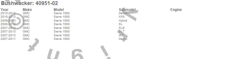 Brand: BushwackerPart Number: 40951-02Fender Flare Type: 4 pc. - Front Tire Coverage 2 in. - Front Height 8 in. - Rear Tire Coverage 2 in - Rear Height 8 in. - Smooth Finish - BlackUPC: 090689112903