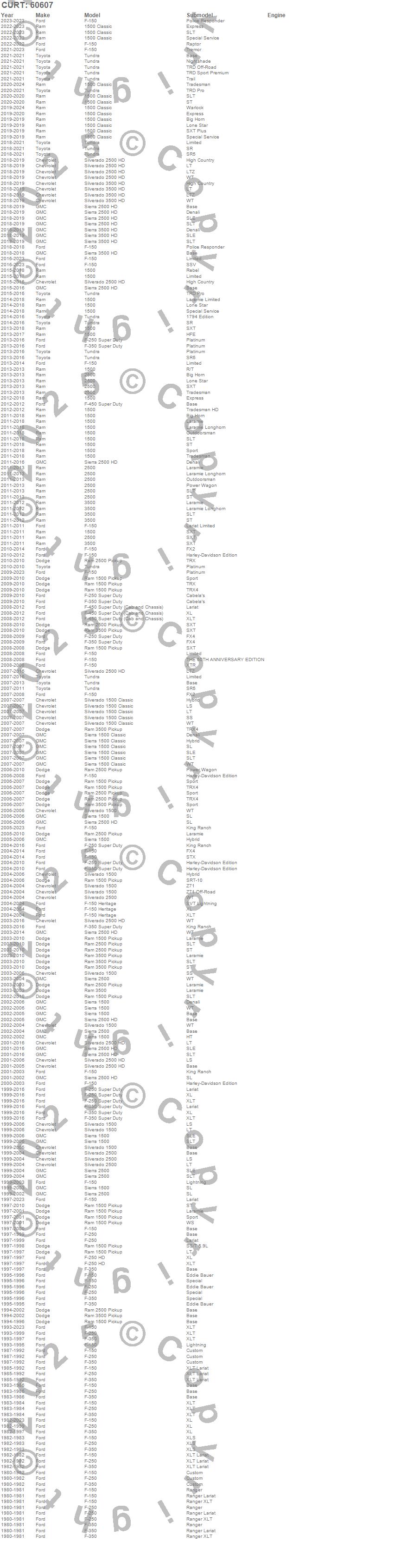 Brand: CURTPart Number: 60607Gooseneck Trailer Hitch Type: Carbide Blk Finish - PC Finish - 30000lbs.GTW - 6000lbs.Tong Wt - w/2 5/16 in.Remov.Chrome Ball - Incl.U-Bolt Chain/Hrdwr - Use w/Install. Kit - Sold SeparatelyUPC: 612314606078