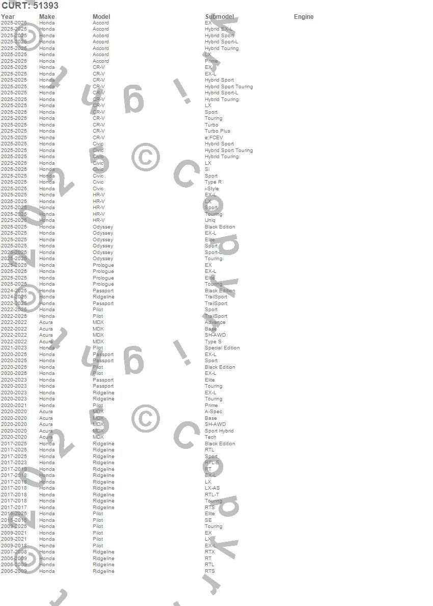 Brand: CURTPart Number: 51393Trailer Brake Control Wire Harness Type: Incl. OEM Connector - 2 ft. Wire - Protective Sleeve - 12 Ga. Wire - w/Quick Plug - PackageUPC: 612314024391