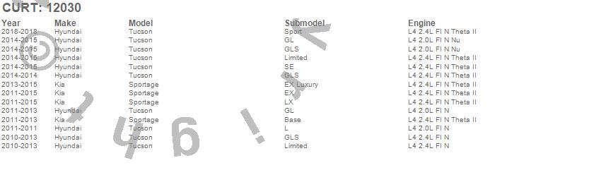 Below is an abbreviated list of applications for the Class II 1.25 in. Receiver Hitch.Sportage, Tucson, Hyundai, Kia, 2018, 2015, 2014, 2013, 2012, 2011, 2010