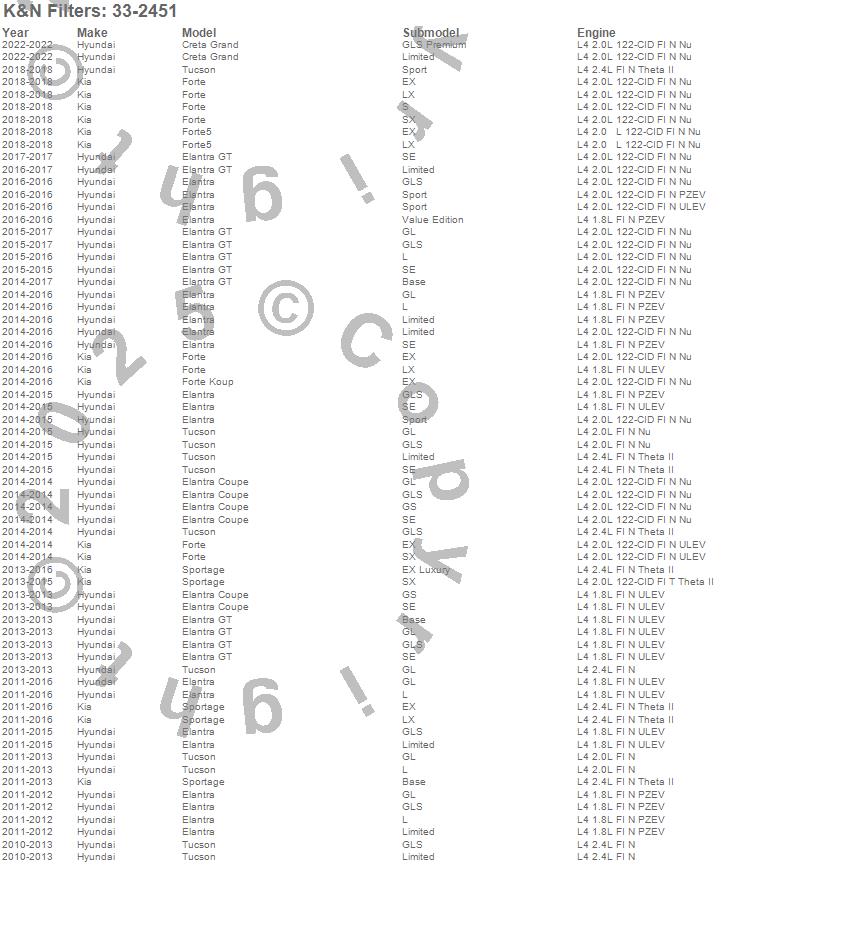 Below is an abbreviated list of applications for the Air Filter.Elantra, Elantra Coupe, Elantra GT, Forte, Forte Koup, Forte5, Sportage, Tucson, Hyundai, Kia, 2018, 2017, 2016, 2015, 2014, 2013, 2012, 2011, 2010