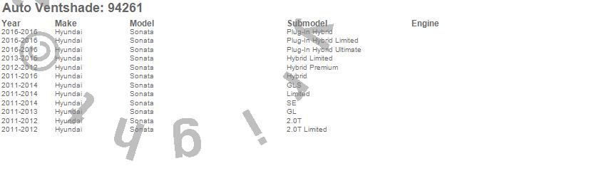 Below is an abbreviated list of applications for the Ventvisor Deflector 4 pc..Sonata, Hyundai, 2016, 2015, 2014, 2013, 2012, 2011