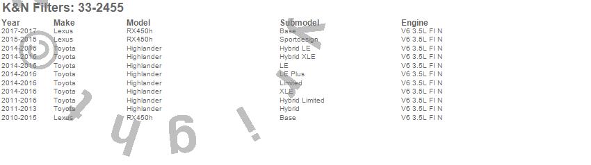 Below is an abbreviated list of applications for the Air Filter.Highlander, RX450h, Lexus, Toyota, 2017, 2016, 2015, 2014, 2013, 2012, 2011, 2010