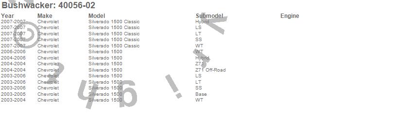 Below is an abbreviated list of applications for the Extend-A-Fender Flares.Silverado 1500, Silverado 1500 Classic, Chevrolet, 2007, 2006, 2005, 2004, 2003