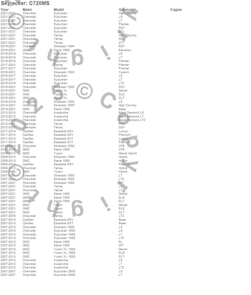 Brand: SkyjackerPart Number: C720MSSuspension Front Leveling Kit Type: Front - 2 in. Lift - Installs Above Strut Assembly - Install Time 2 HoursUPC: 803696189178